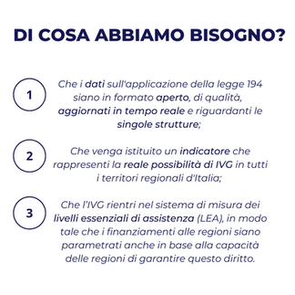 L'aborto è un diritto e in quanto tale deve essere tutelato e garantito allo stesso modo in tutta Italia. Per questo chiediamo: 1) che i dati sull'applicazione della legge 194 siano in formato aperto, di qualità, che vengano aggiornati in tempo reale e che riguardino le singole strutture; 2) che venga istituito un indicatore che rappresenti la reale possibilità di IVG in tutti i territori regionali d'Italia; 3) che l’IVG rientri nel sistema di misura dei livelli essenziali di assistenza (LEA), in modo tale che i finanziamenti alle regioni siano parametrati anche in base alla capacità delle regioni di garantire questo diritto.